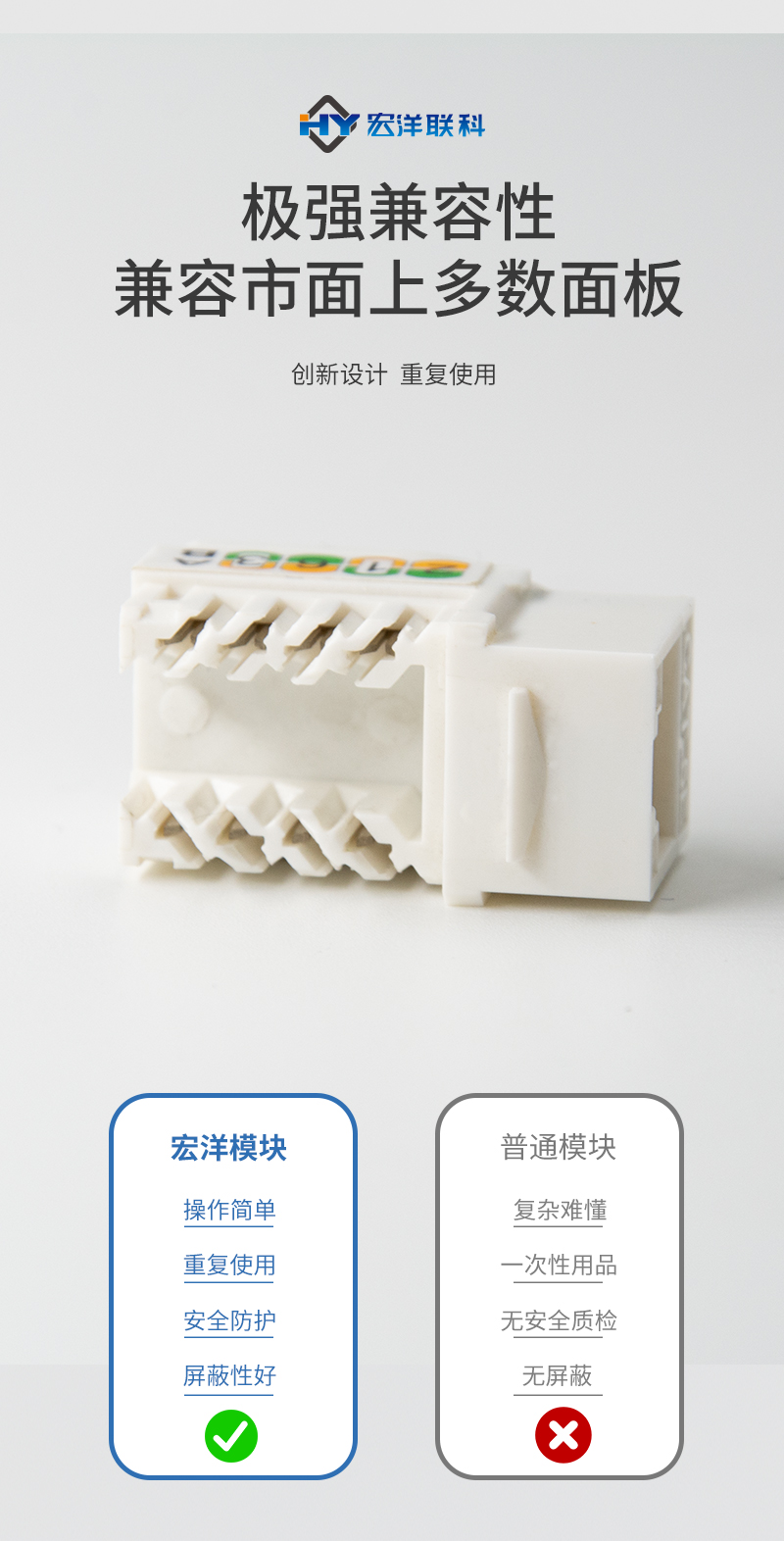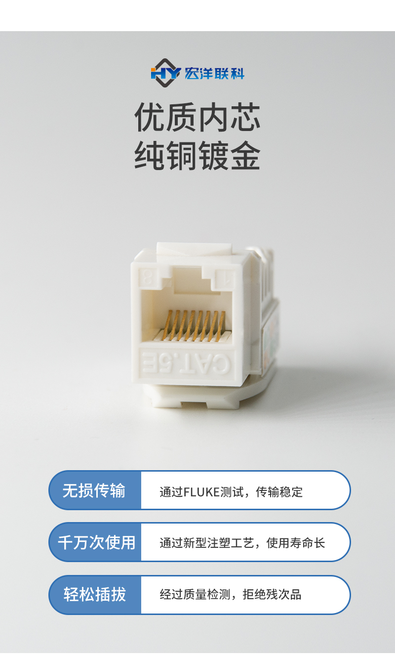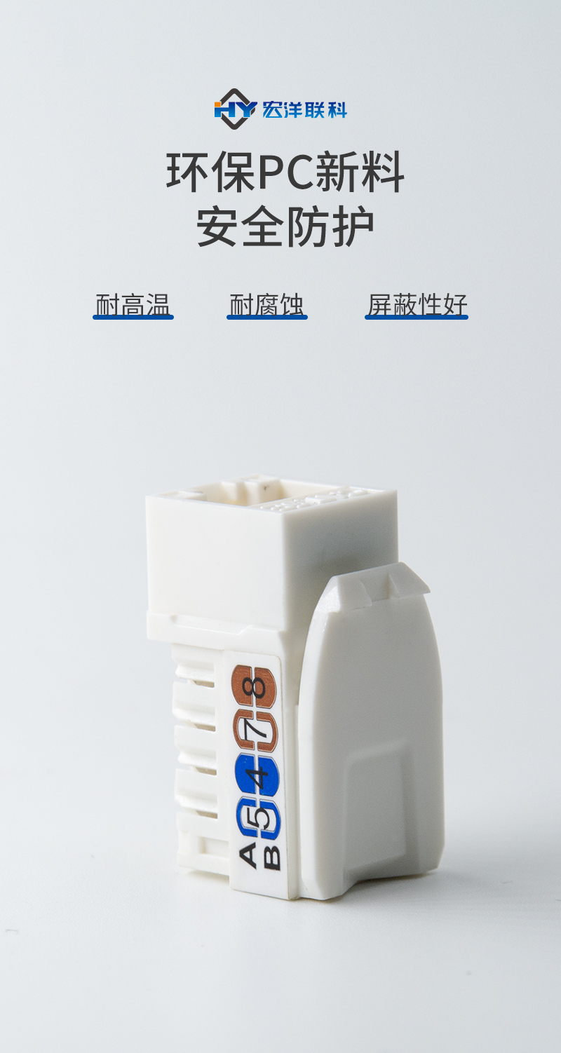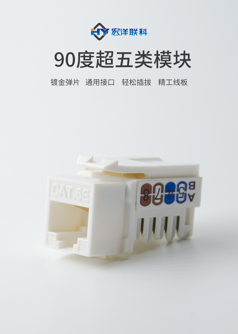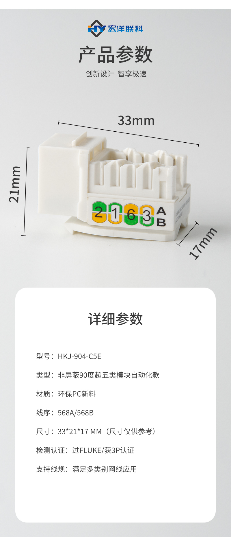 型号:HKJ-904-C5E 类型:非屏蔽90度超五类模块自动化款 材质:环保PC新料 线序:568A/568B 尺寸:33*21*17 MM(尺寸仅供参考) 检测认证:过FLUKE/获3P认证 支持线规:满足多类别网线应用