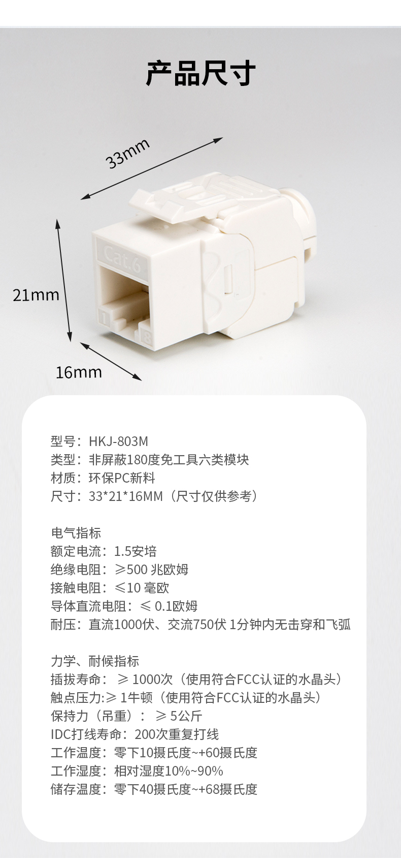 触点压力:≥ 1牛顿(使用符合FCC认证的水晶头)