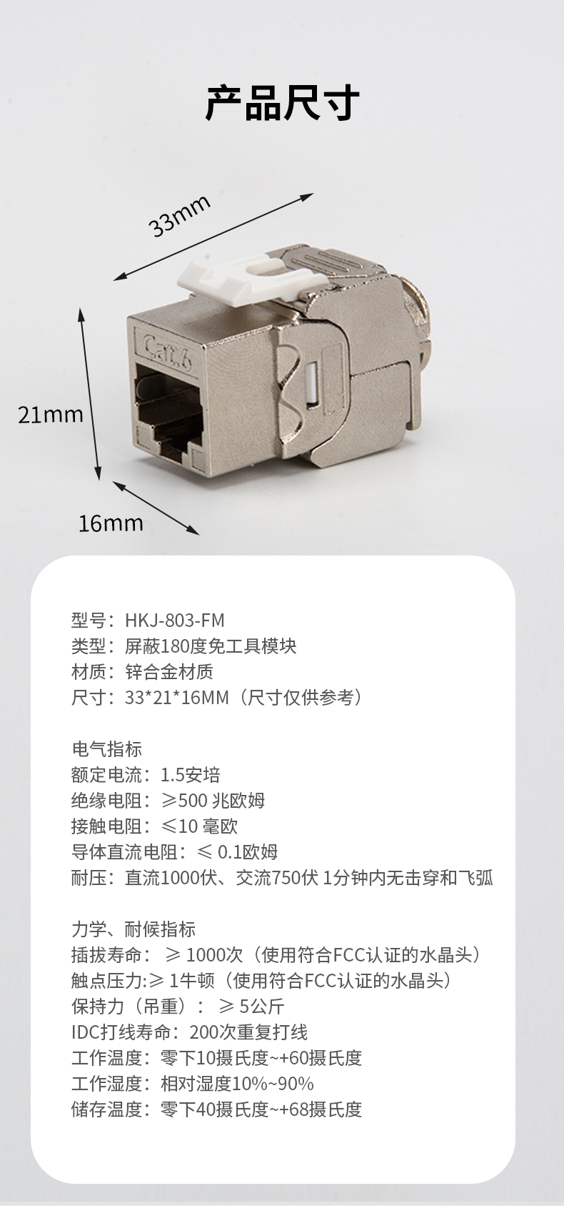 触点压力:≥ 1牛顿(使用符合FCC认证的水晶头)